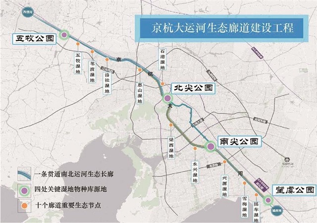 岸線全面覆綠、生態(tài)通道提質(zhì)、水岸空間重構(gòu)……明年底,通過生態(tài)廊道工程的建設(shè),一條貫通南北運(yùn)河的生態(tài)長廊將展現(xiàn)在世人面前。利用大運(yùn)河的聯(lián)通性,這條綠帶上將構(gòu)建起“一廊、四源、十節(jié)點(diǎn)”的空間布局。4個(gè)“物種庫”源地分別為五牧公園、北尖公園、南尖公園、望虞公園,它們是濕地鳥類的天堂、濕地魚類的樂園,能展現(xiàn)濕地凈化的魅力,又集運(yùn)河植物的大觀。從五牧濕地到搖車濕地,由北向南如珍珠般鑲嵌其中的10個(gè)重要生態(tài)節(jié)點(diǎn),將成為運(yùn)河水生生物的暫棲地,為這道絕美風(fēng)景錦上添花。