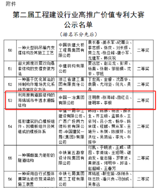 近日,在中國施工企業管理協會舉辦的第二屆工程建設行業高推廣價值專利大賽上,中國一冶城建公司推薦的《利用原有道路結構的海綿城市半透水道路結構》專利技術榮獲二等獎。