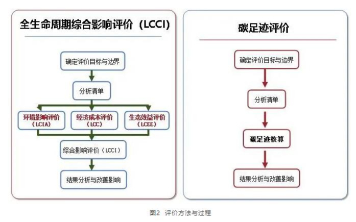 評(píng)價(jià)方法采用全生命周期綜合影響指標(biāo)(LCCI,見參考文獻(xiàn)1)與碳足跡核算評(píng)價(jià)方法(見參考文獻(xiàn)2),評(píng)價(jià)方法與過(guò)程如圖2所示。