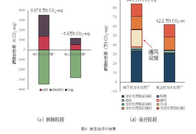 案例污水處理廠全生命周期碳足跡評(píng)價(jià)結(jié)果如圖4所示。地下廠全生命周期總碳排放量約87.1 萬(wàn)t CO2-eq,較地上廠高36.5%,其中,運(yùn)行階段碳排放量可達(dá)總量的95%以上。由于地下工程結(jié)構(gòu),地下廠在建設(shè)(圖6b)與拆除階段(圖6c)中,需要額外的施工量與建材消耗;在運(yùn)行階段(圖6c),則需額外通風(fēng)、照明等電力消耗。因此,地下廠運(yùn)行階段(20年)總碳排放量較地上式高35.8%;其中,地下廠額外通風(fēng)產(chǎn)生的碳排放量約18.4萬(wàn)t CO2-eq,占總排放量的22%。可見,地下式污水處理廠全生命周期中會(huì)產(chǎn)生大量碳排放,不符合碳減排、碳中和的社會(huì)發(fā)展方向。