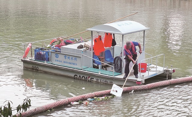在老大運河中吳大橋段,兩座長達20多米的漂浮物攔截設施橫貫水面,如同一張過濾網,攔截上游漂浮來的垃圾,等待河道保潔員清理。“一天最起碼能收集到五六船垃圾,有七八百斤。有了這個攔截設施,河面上的垃圾基本不會往下游去了。”市河道湖泊管理處河道保潔隊隊長蔣建國介紹。