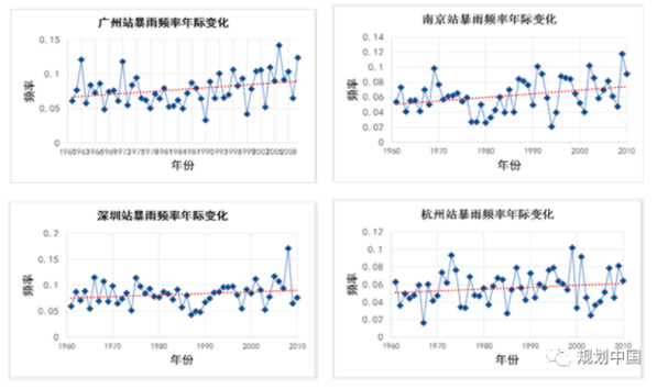 分析全國主要城市60年來的氣象數(shù)據(jù)發(fā)現(xiàn),隨著溫度升高,短歷時強降雨天氣增加,大多數(shù)城市暴雨都更多了,這是一個趨勢,增加了城市洪澇災(zāi)害的風(fēng)險。