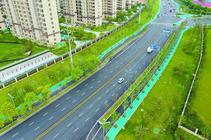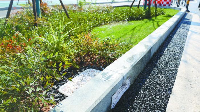 鷹東大道海綿化改造項目在城市道路主脈絡(luò)上落實了海綿城市理念,奏響了和諧共生新樂章。該項目位于信江新區(qū)北部,北起龍虎山大道,南至鷹東大橋北側(cè)橋頭,道路全長約4.3公里,新建道路斷面24米至55米,定位為城市主干道。通過開口路緣石將車行道內(nèi)雨水引入側(cè)分帶內(nèi)下沉式綠地;在人行道下設(shè)置過水通道,將非機動車道雨水引入防護(hù)綠地,防護(hù)綠地同時還收集相鄰地塊內(nèi)徑流,經(jīng)下沉式綠地凈化、滯蓄后排入雨水管道,實現(xiàn)了道路海綿設(shè)施與周邊地塊的結(jié)合與聯(lián)動,增強了海綿城市建設(shè)的系統(tǒng)性;人行道采用透水鋪裝,滲排管收集滲水排入雨水管道,實現(xiàn)了對道路全斷面徑流的管控。建成后年徑流總量控制率為82.8%,透水鋪裝面積為3.2585萬平方米,透水鋪裝率14.6%,SS(固體懸浮物)去除率為74.52%。此外,由于鷹東大道雨水管道雨水排入相鄰石鼓渡河,故而在雨水排口處做消能及生態(tài)化處理措施,進(jìn)一步消除面源污染,保障入河水質(zhì)。