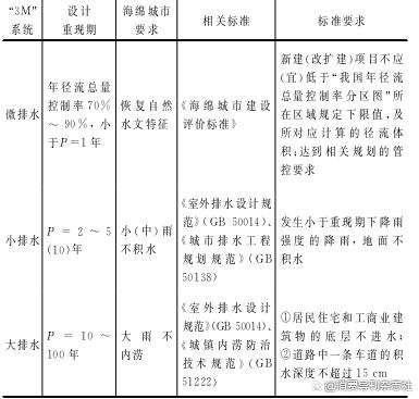 內(nèi)澇成因復雜,解決內(nèi)澇必須從問題產(chǎn)生的根源著手,運用滯、蓄、排等技術(shù)手段,充分發(fā)揮基于海綿城市理念的“3M”系統(tǒng)效能,綜合治理(見表1)。源頭減排系統(tǒng)旨在恢復場地開發(fā)前自然水文特征,應對低強度大概率(一般在1年一遇重現(xiàn)期以下)的中小降雨事件;小排水系統(tǒng)重點解決及時排除短時強降雨帶來的徑流量劇增,應對較大概率的短歷時強降雨事件,一般在2——10年一遇降雨條件下達到“地面無積水”;大排水系統(tǒng)重點是對超標徑流進行合理蓄、排,應對小概率的超強降雨 事 件,一般在10——100年一遇降雨條件下,滿足“大雨不內(nèi)澇”。海綿城市理論的系統(tǒng)性要求“3M”各系統(tǒng)之間在規(guī)劃設計、標準應用、豎向控制等方面做好充分銜接,綜合發(fā)揮效能,應對水生態(tài)與水安全問題。
