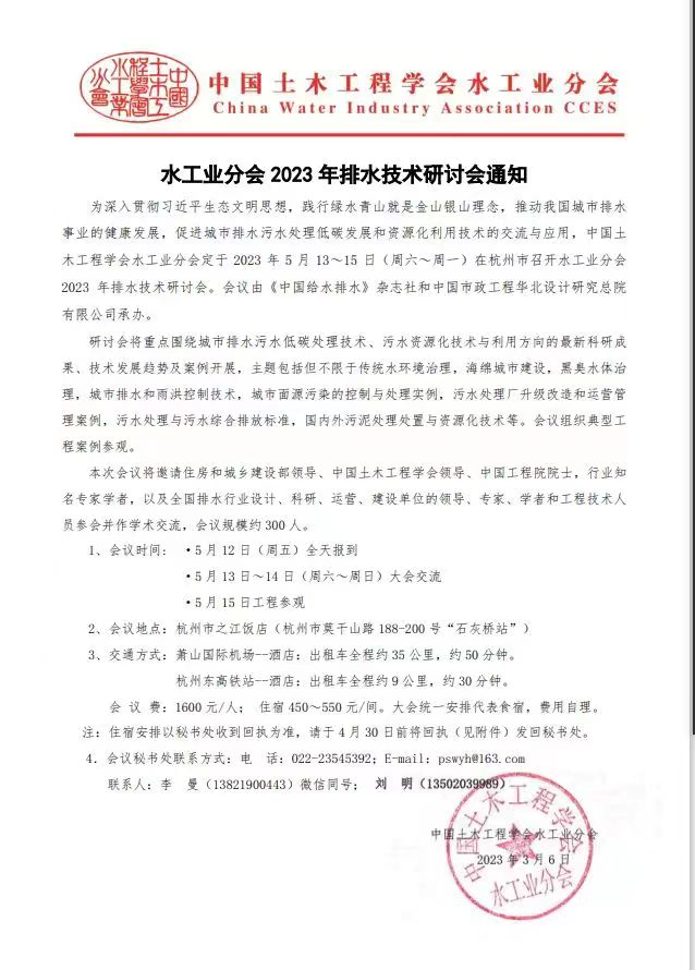 2023水工業(yè)分會排水技術(shù)研討會會議通知