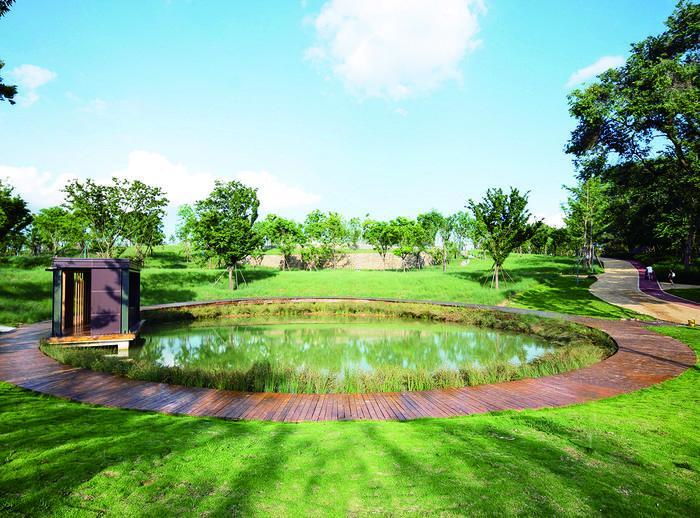 項目在設計時利用數據模型研究地表徑流、生態廊道,對挖、填方以及可能存在的生態風險進行判定,在重要節點結合地形地貌與功能性質,因地制宜地進行改善。場地內原有兩處低洼區,積水來源于周邊地形帶來的地表徑流和降雨,夏季洪澇嚴重。通過將東側低洼坑塘轉化為“潮汐湖”花園,搭配圍合景墻和水生態植被,既滿足兒童的戲水需求,又兼顧雨水收集調蓄的生態功能;西側地勢低洼區積水嚴重,不適宜布置住宅建筑,早期規劃沒有正確理解人地關系,此次通過將原有的老舊民宅移除,建造成一處雨水花園,充分體現海綿城市“滲、滯、蓄、凈、用、排”六字方針。項目以生態方法蓄水、凈水,需要時將水加以利用。被木棧道和燈芯草環繞的雨水花園和外形簡潔的景觀亭成為這一片區的視覺中心。公園整體形成了適應自然的動態景觀,展現了真實的自然狀態。