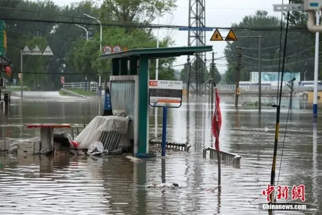7月31日,北京市房山區(qū)竇店鎮(zhèn)蘆村,臨近大石河的一條村內道路被淹。