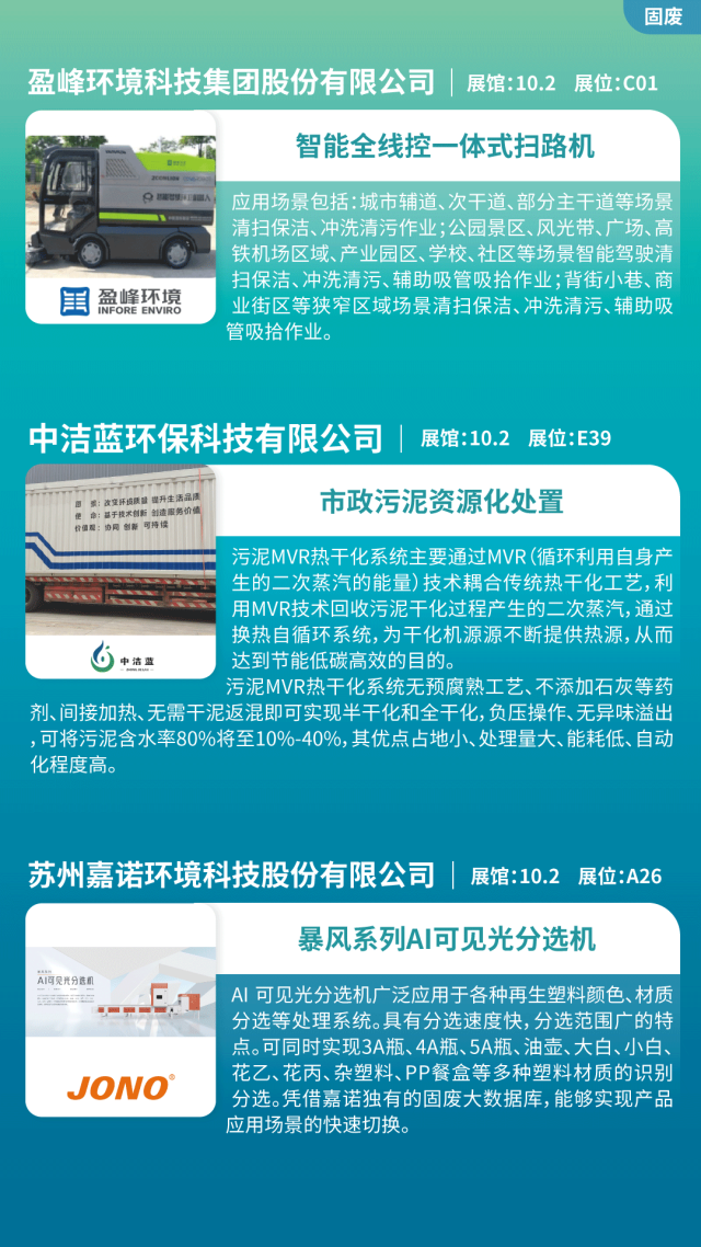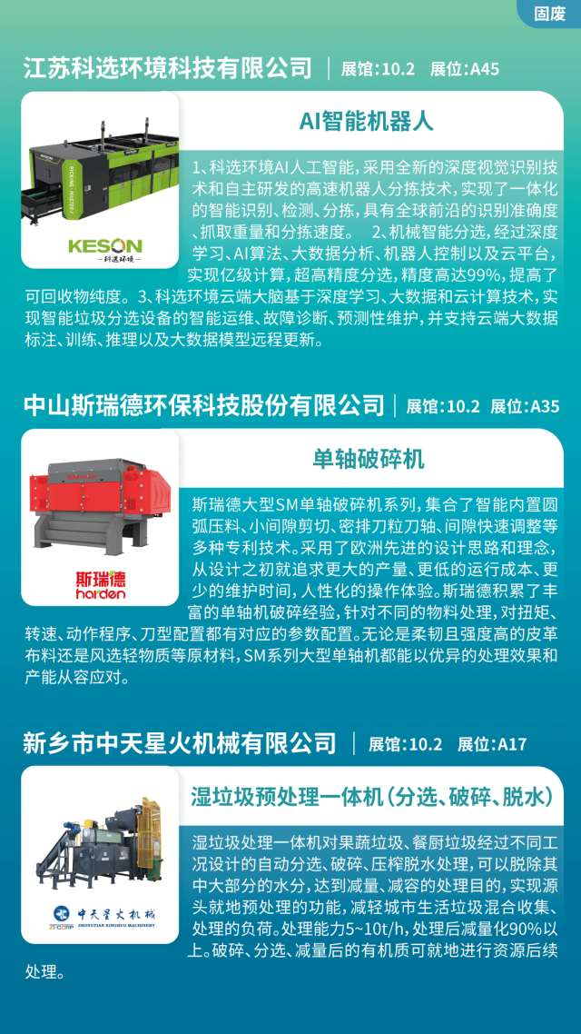 污泥處置、分選機、垃圾焚燒、餐廚垃圾處理、垃圾滲濾液、垃圾分選機、破碎機、脫水機、濕垃圾處理一體機、AI智能機器人、環衛車輛、智能垃圾桶、畜禽廢棄物處置等。