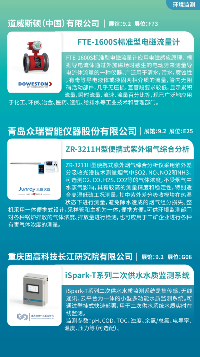 傳感器、水質檢測系統、土壤重金屬分析儀、煙氣排放監測系統、電磁流量計、智慧AI監控系統、便攜式有毒揮發氣體分析儀、粉塵濃度測量儀、噪聲在線監測系統等。