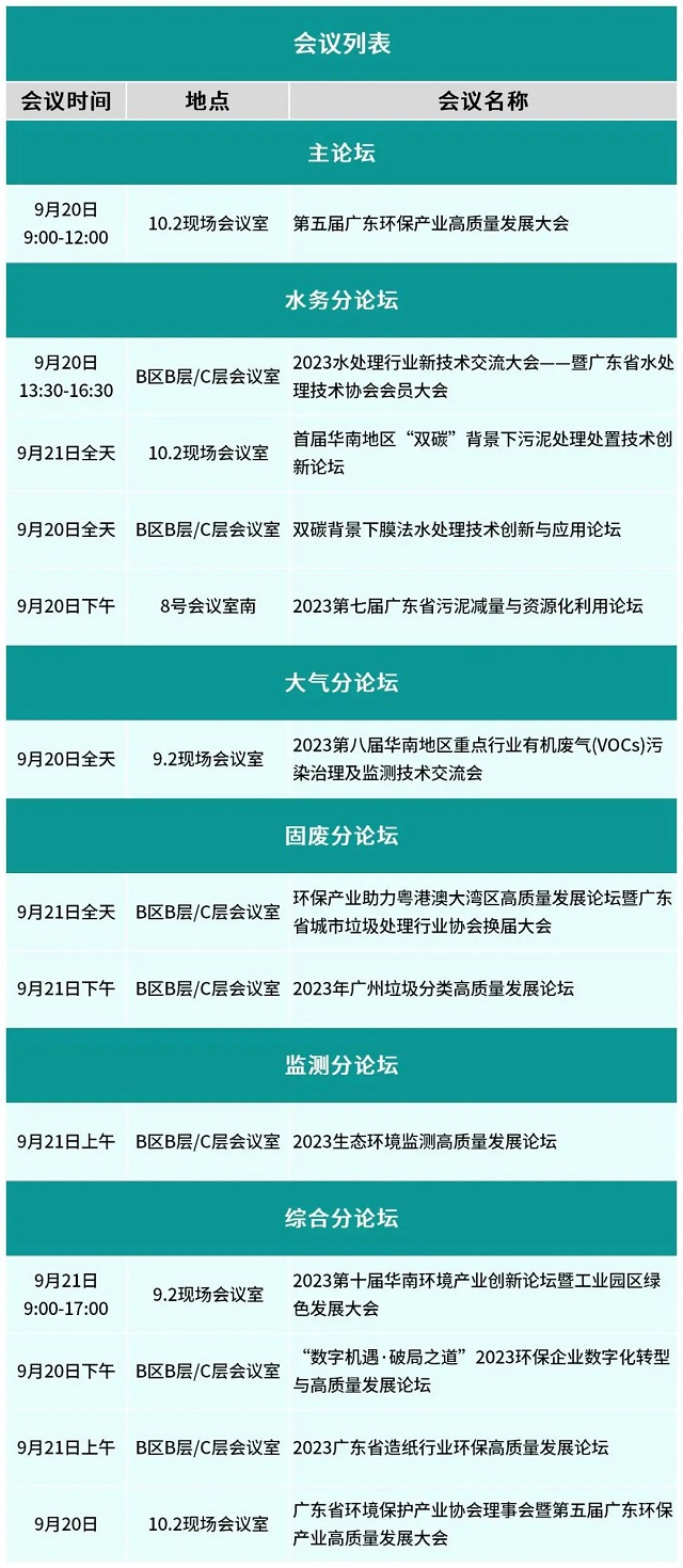 作為一年一度的華南環保行業交流盛會,中國環博會廣州展深挖行業資源,升級展會內容配套,全力促進業內商貿交流與資訊分享,在為期3天的展期中,舉辦“第五屆廣東環保產業高質量發展大會”等20余場精彩紛呈、聚焦行業熱點的專題論壇、配套活動貫穿展會,大咖匯聚,多元思維跨界,深化行業交流與合作。此外展會同期還將舉辦廣東環保產業發展情況發布會、新技術新產品發布會、高校院所科技成果發布會、人才需求發布會、污染防治市場需求發布會、大型環保企業采購合作發布會等一系列行業發布會。