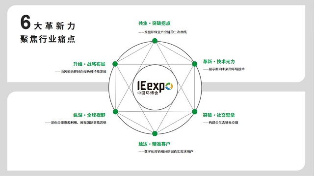 為適應當前的發展形勢,中國環博會IE expo將持續推進六大能力的自我革新,即:一、拓展數智化等跨界產業與傳統環保產業的共融交集,提升平臺“共生力”,發掘環保全產業鏈內的發展第二曲線;二、由污染治理轉向綠色可持續發展,培育在碳中和領域的戰略布局,提升平臺“升維力”;三、展出面向未來的環境技術,提升平臺“革新力”,提升環保科技創新動能;四、深化IFAT全球資源的利用,展現國際前瞻思維,提升平臺“視野力”;五、創造平臺打破創新鏈、產業鏈、資金鏈、人才鏈的融合壁壘,提升平臺“社交力”;六、深化數字營銷體系,配合發起關鍵營銷戰役,精準聚攏真實需求用戶人群,提升平臺“觸達力”。