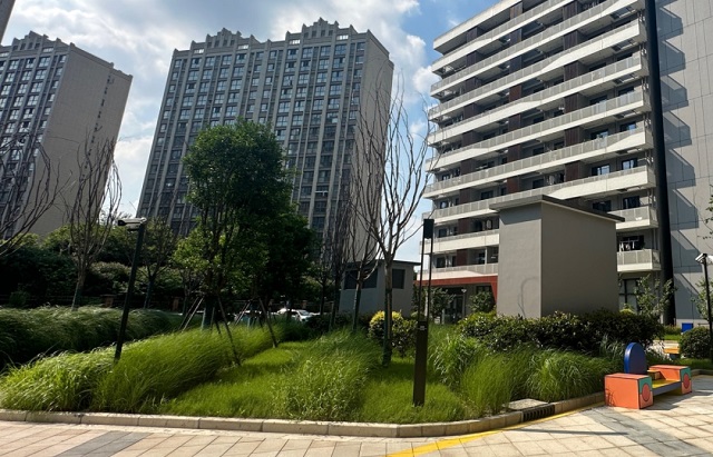 據悉,項目優化下墊面,采用透水鋪裝降低場地徑流系數,增加雨水下滲,實現社區內小雨不積水的效果,還能通過滲入透水鋪裝內部雨水的蒸發,緩解城市熱島效應;同時,利用植草溝收集、轉輸地表徑流,以自然形成或人工挖掘的淺凹綠地匯聚并轉輸來自地面的雨水,再通過植物、沙土的綜合作用凈化雨水,使之逐漸滲入土壤,達到涵養地下水的目的。
