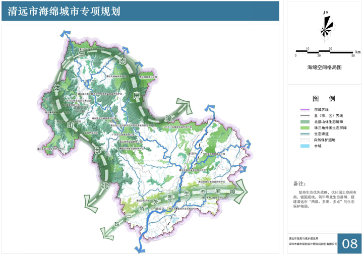 根據《規劃》,清遠將構建“兩屏、多廊、多點”的海綿生態空間格局。“兩屏”即北部環形生態屏障和珠三角外圍生態屏障。強化與周邊連綿山體的空間銜接和協同治理,推進南嶺、筆架山、三桂山等山體屏障的生物多樣性保護、水土保持及水源涵養,筑牢生態安全屏障,以限制城鎮建設無序擴張。生態屏障內限制開發建設行為,針對連接屏障之間的耕地、城鎮等用地進行嚴格管控,禁止破壞生態安全的活動,保障屏障的連續性和生態安全格局的完整性。