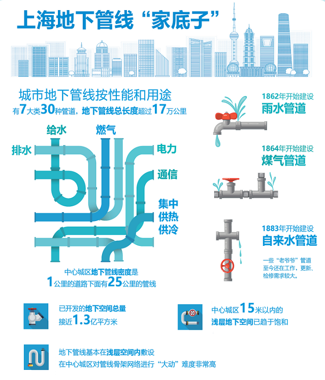 市政管線是城市的生命線。目前上海地下管網按性能和用途已有給水、排水、燃氣、電力、通信、集中供熱供冷等7大類30種管道,地下管線總長度超過17萬公里。總體而言,上海的地下管線建設和管理一直處于全國領先水平。