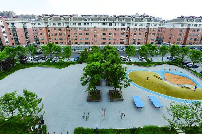 建設(shè)休閑活動廣場,滿足居民活動休憩需求。對現(xiàn)狀活動廣場進行改造,增設(shè)兒童活動區(qū)、運動健身區(qū)、活動觀影區(qū)、林蔭休閑區(qū)等,建設(shè)透水停車位、雨水花園、蓄水模塊、澆灌回用設(shè)施,具有豐富的海綿城市建設(shè)技術(shù)的展示效果,同時滿足居民休憩活動的需要。