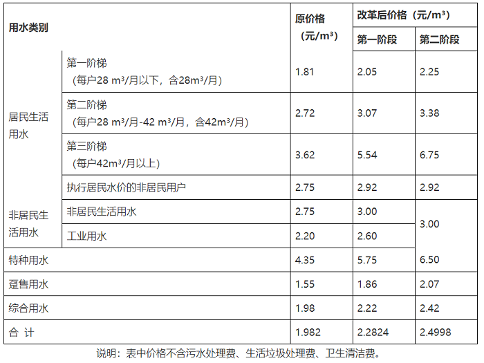 1.居民生活用水價格調整為2.26元/立方米;2.非居民用水價格調整為3.41元/立方米;3.特種行業用水價格調整為9.41元/立方米;4.其他行業用水價格保持1.00元/立方米。