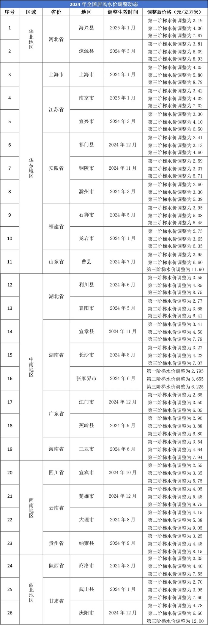 【附】2024年調整水價的城市匯總(數據來自“水務加”微信公眾號):